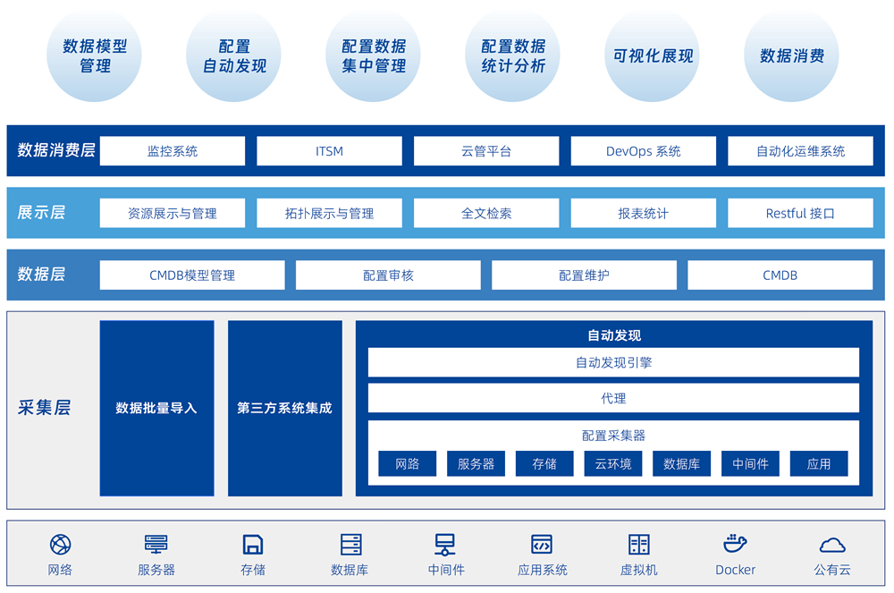 帮助用户建立统一的运维主数据,,,,通过各种自动化手段实现以应用为核心的全面资源管理以及运维消费场景共享。。。。系统具备灵活的 CMDB 分层建模和配置信息维护机制,,,,可以提供面向业务的 IT 架构画像,,,为各个运维工具提供集中化的资源信息管理和协同,,,,为 IT 运维和 DevOps 体系下的各种运维场景提供数据消费服务。。