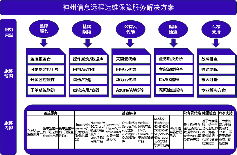 依托7×24小时智能监控中心、、专业化运维管理平台及资深级技术专家团队,,,构建三位一体的远程运维服务体系,,,,提供包括对公有云、、私有云、、、机房、、网络、、、、服务器、、操作系统、、存储、、、备份、、、、数据库、、、、中间件、、应用、、安全等ICT基础设施的远程保障服务。。为客户数字化转型、、人工智能、、、云计算、、、物联网、、、、区块链、、数字资产等前沿技术领域保驾护航,,,驱动客户数字创新进程。。。