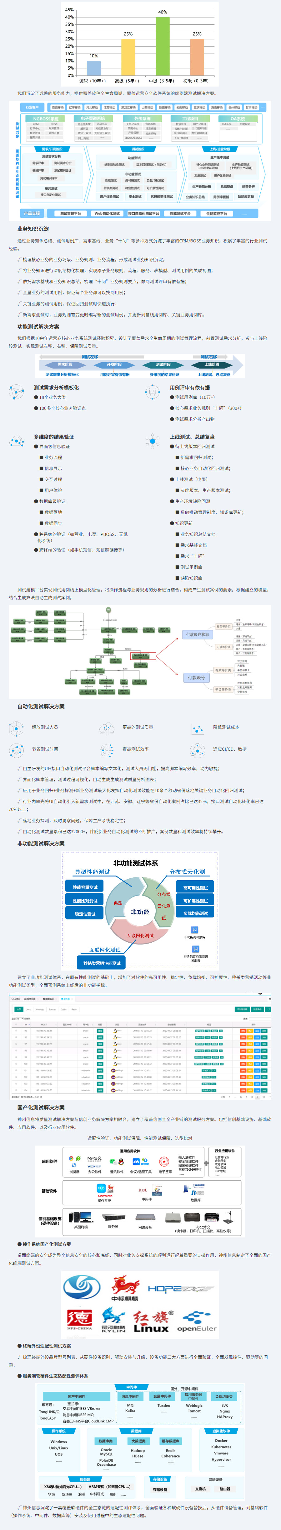 结合运营商测试服务经验总结、、、、提炼的适合运营商工作模式、、、、业务系统架构的测试方法,,,,具有广泛的推广性。。。方案涉及功能、、、、性能、、、高可用、、国产化等多个维度,,,实操性强、、、落地性强,,,,新项目可以结合实际情况进行裁剪、、、、快速落地。。。